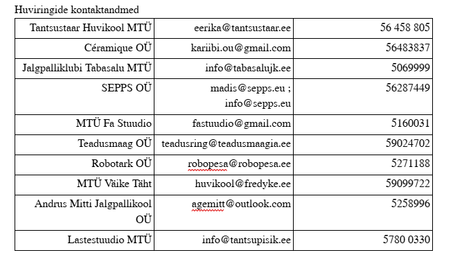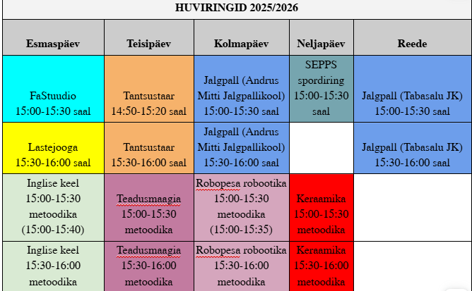 2025/26 õppeaastal tegutsevad Alasniidu Lasteaias huviringid järgmise tunniplaani alusel: